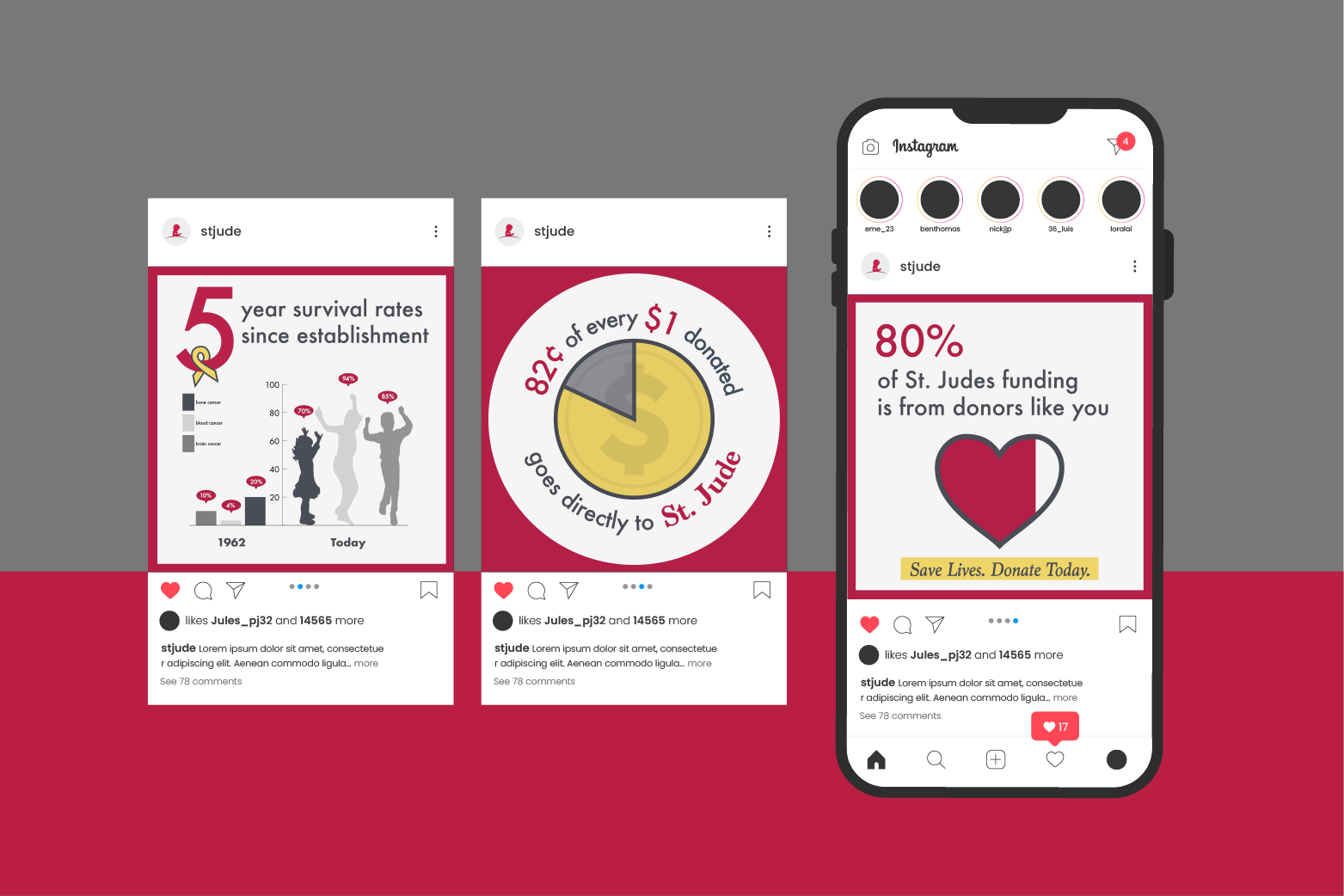 A three-part campaign project visualizing key statistics for Saint Jude. This project demonstrates my ability to translate complex data into clear, engaging visuals, combining charts, infographics, and design elements to communicate important information effectively.